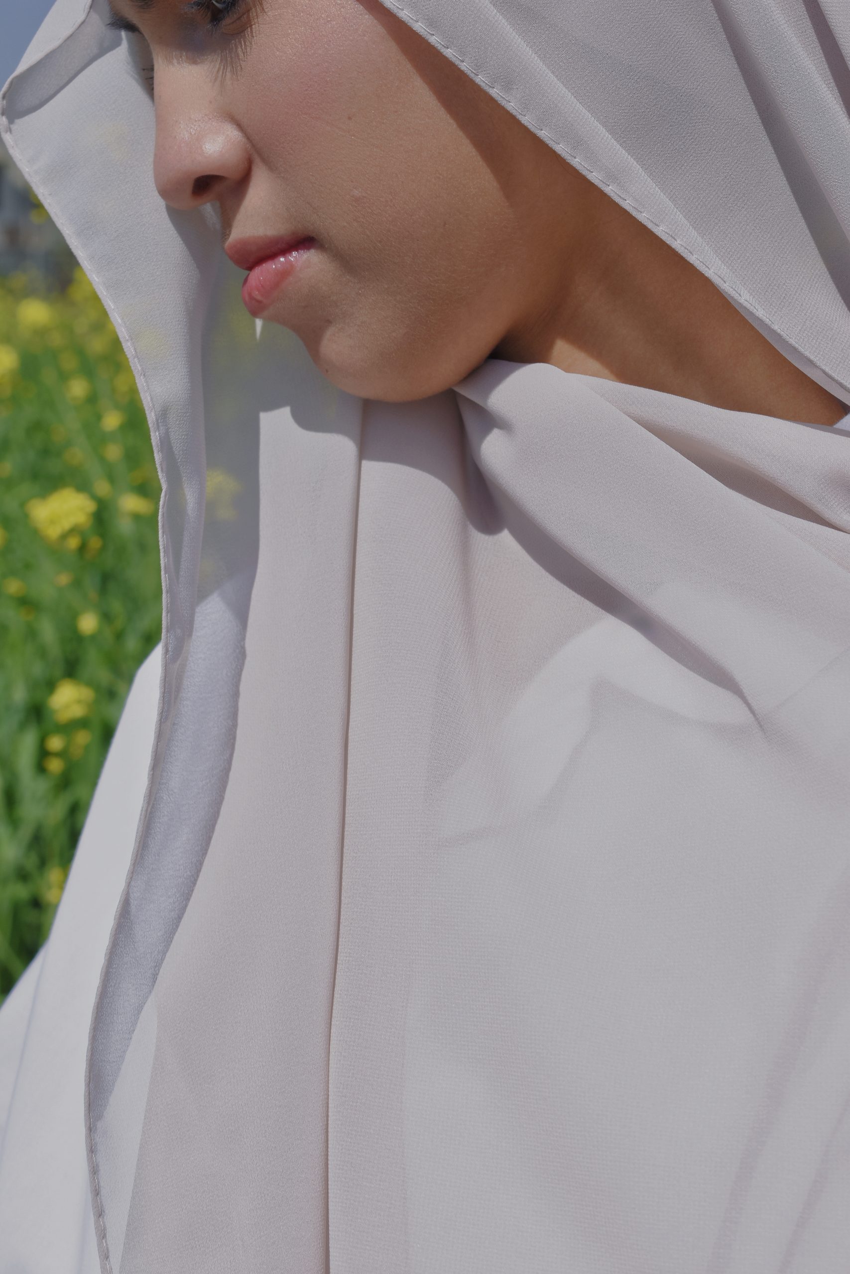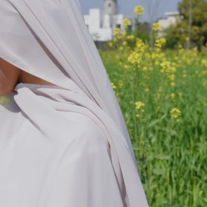 Imported chiffon georgette. cold wash and hand dry. Please note: To maintain the integrity of this design, avoid pulling or applying excessive pressure on the seam where the under-cap and hijab are joined.